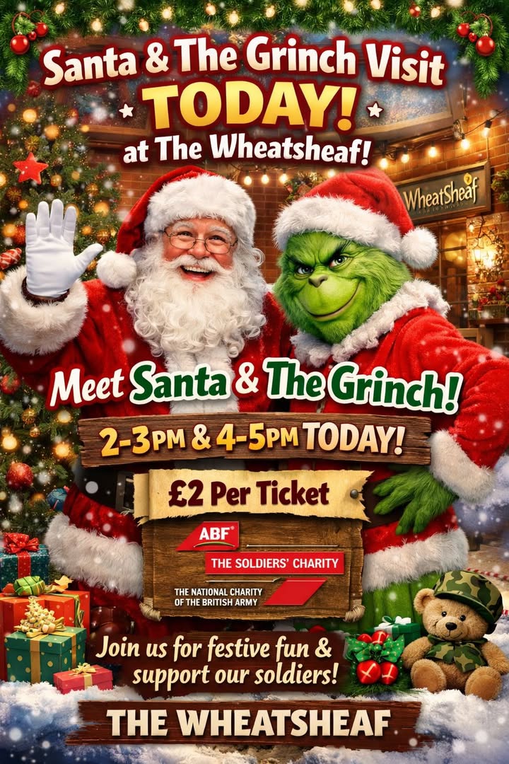 🎅🎄 Santa & The Grinch Visit TODAY at The Wheatsheaf! 🎄🎅 Santa and the Grinch are popping in TODAY for photos, laughs and festive fun! ✨ 2–3pm & 4–5pm ✨ 🎟️ £2 per ticket ❤️ All proceeds go to ABF – The Soldiers’ Charity Bring the kids, grab a picture, and support an amazing cause while getting into the Christmas spirit 🎁🎄 📍 The Wheatsheaf #SantaVisit #GrinchVisit #TheWheatsheaf #ChristmasFun #FamilyFun #ABF #SoldiersCharity #FestiveFeels